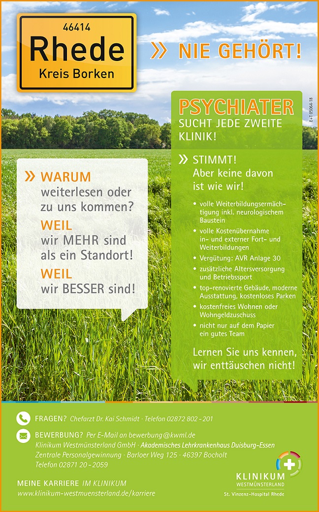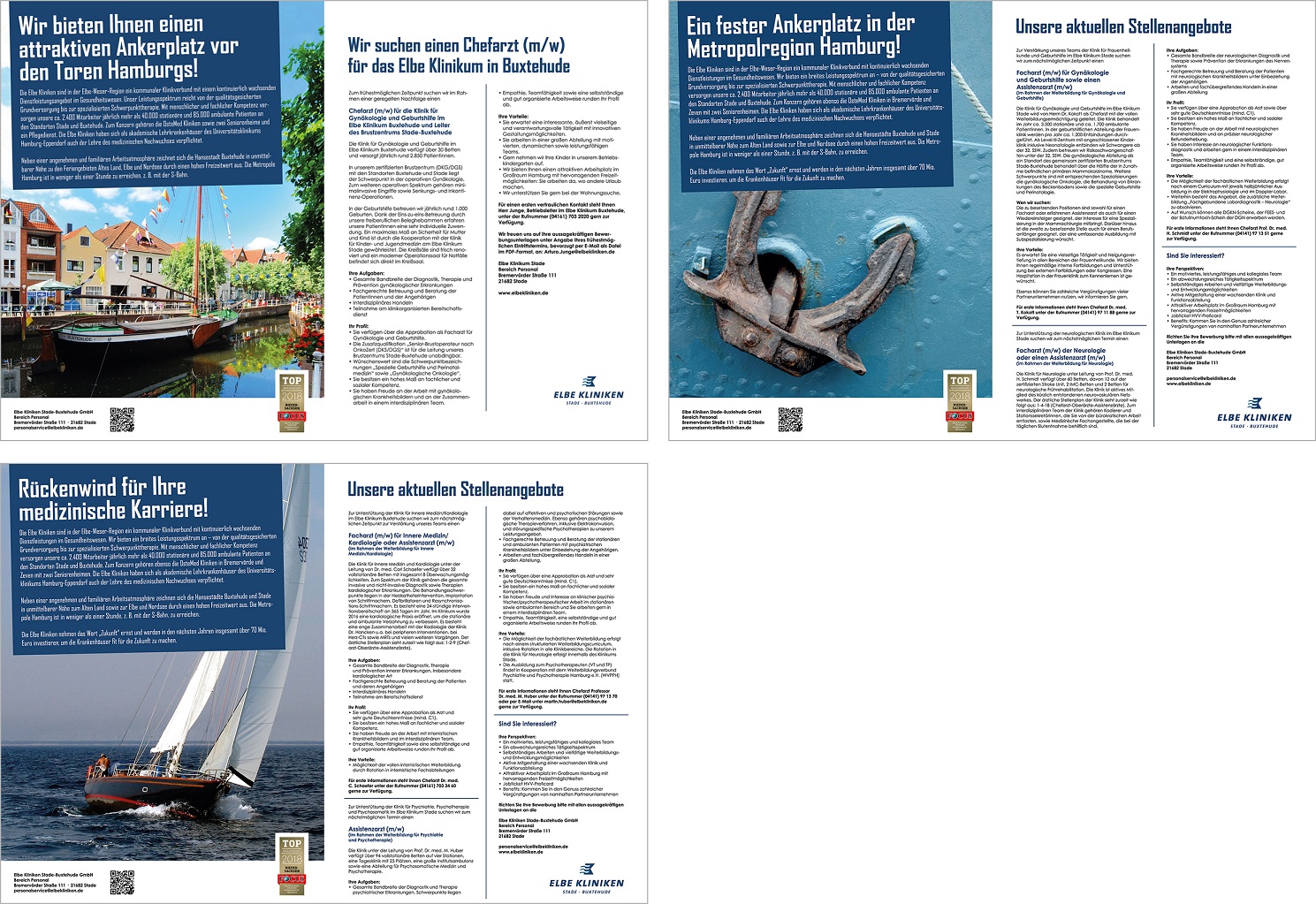Insgesamt stehen 15 Nominierte in fünf Kategorien im Rennen um das große Finale. Die Sieger werden anlässlich des Kongresses „KlinikManagementPersonal“ am 19. März 2019 in Hannover gekürt. Von rund 70 Einsendungen haben diese ärztlichen Stellenanzeigen es bis ins Finale geschafft: BIG CAMPAIGN – Die beste Stellenanzeigenkampagne- „Ein fester Ankerplatz in der Metropolregion Hamburg!“, von: Elbe Kliniken Stade-Buxtehude / Agentur: Schult-Media
