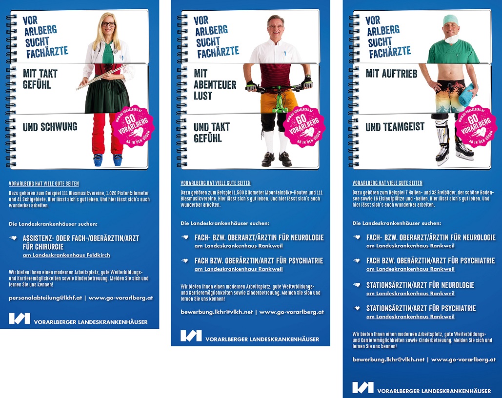 - „Vorarlberg sucht Fachärzte mit Taktgefühl, Abenteuerlust und Auftrieb“, von: Vorarlberger Krankenhausbetriebsgesellschaft / Agentur: Ehgartner id