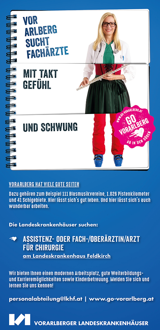 - „Vorarlberg sucht Fachärzte mit Taktgefühl und Schwung“, von: Vorarlberger Krankenhausbetriebsgesellschaft / Agentur: Ehgartner id