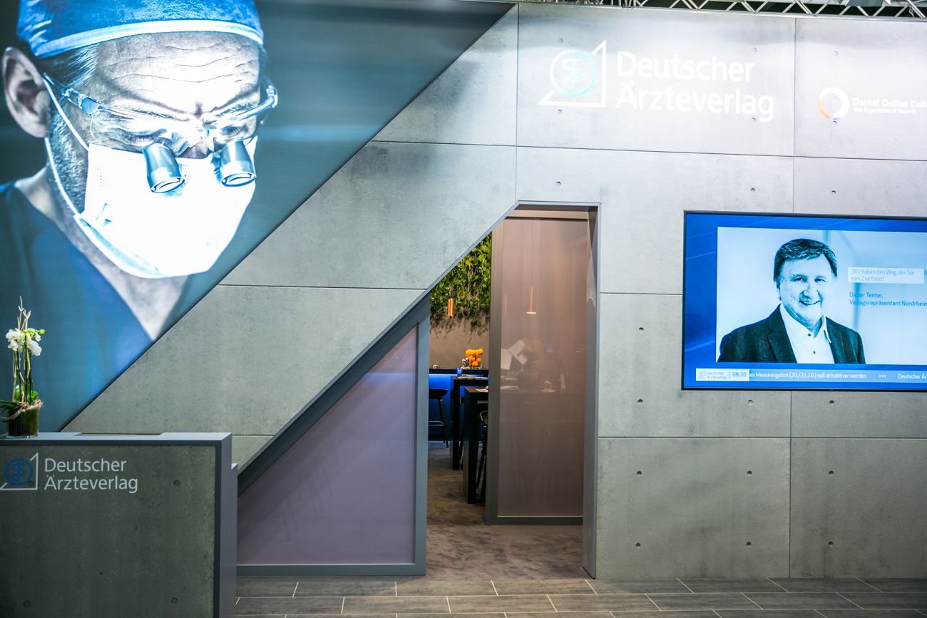 Es ist bereits Tradition: Während die Internationale Dental-Schau (IDS) für die Dentalbranche die wichtigste Leitmesse bedeutet, bildet der Stand des Deutschen Ärzteverlags einen zentralen Messe-Treffpunkt. Für die diesjährige IDS hat der Verlag keine Kosten gescheut und den Stand rundum erneuert. Klicken Sie sich durch unseren neuen Stand!- Unsere neue CI kommt in einem modernen Stand-Design und mittels ausgewählter Materialien wie elegantem Sichtbeton und hochwertigem Kupfer voll zur Geltung.