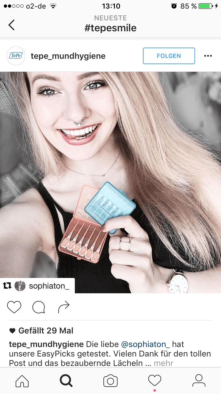 Dass hashtaglove.de für eine Kampagne Reichweite generieren kann, zeigt die Word-of-Mouth-Kampagne von TePe EasyPickTMDie Kampagne für das neue Produkt TePe EasyPickTM wurde mit dem Hashtag #TePesmile auf der Influencer-Plattform hashtaglove.de beworben.