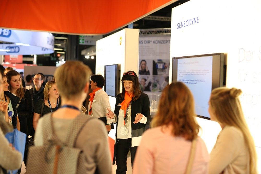 GSK-Stand. Nach einem gut gelaunten Empfang geleiten die Hostessen einen in den Vortragsraum, wo eine Moderatorin durch eine interaktive Präsentation über Mundhygiene und Lösungsansätze des GSK-Portfolios führt. Wissenschaftlich, aber leicht verständlich aufbereitet.